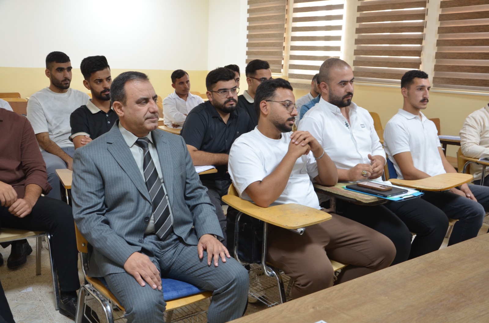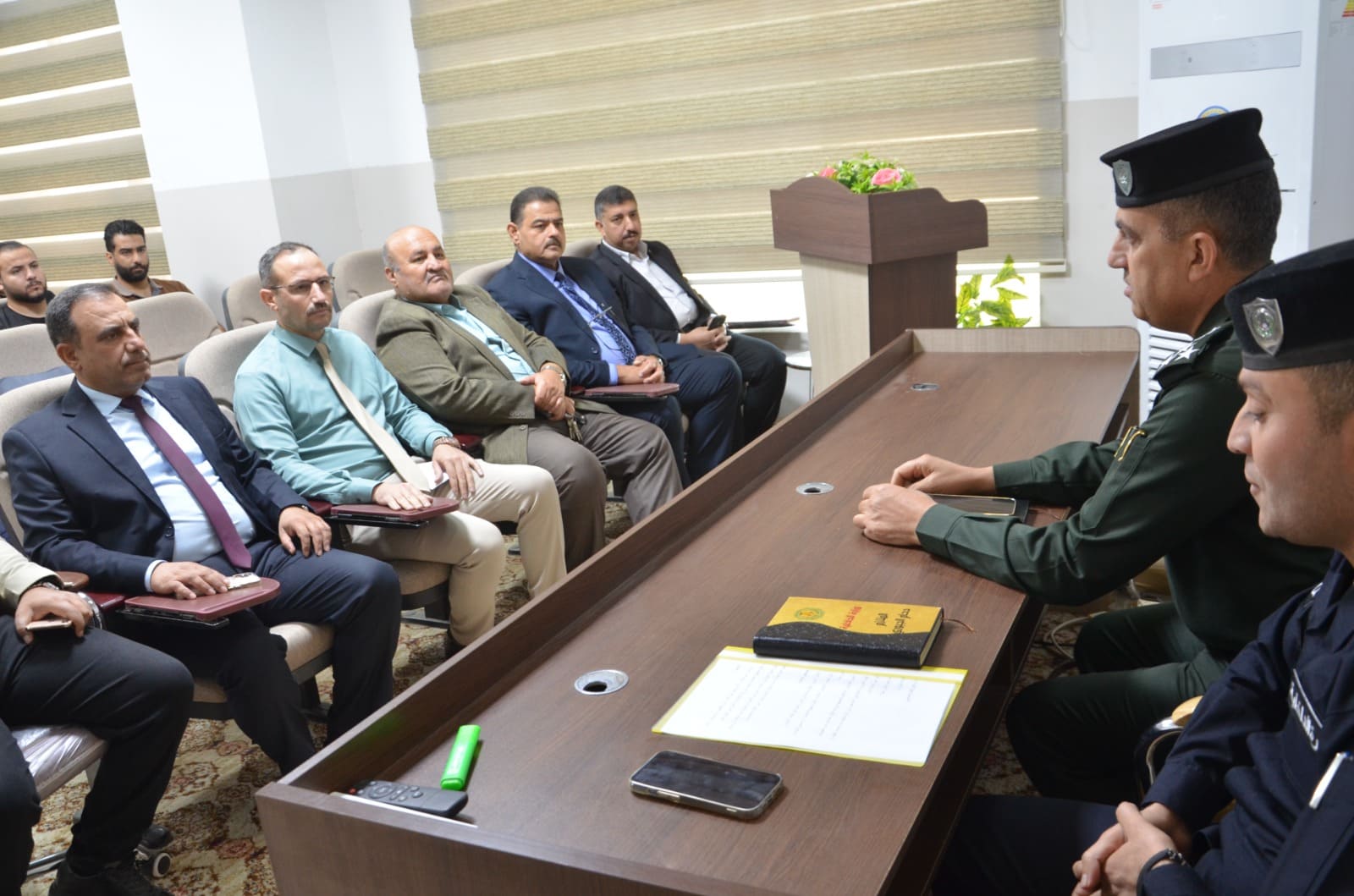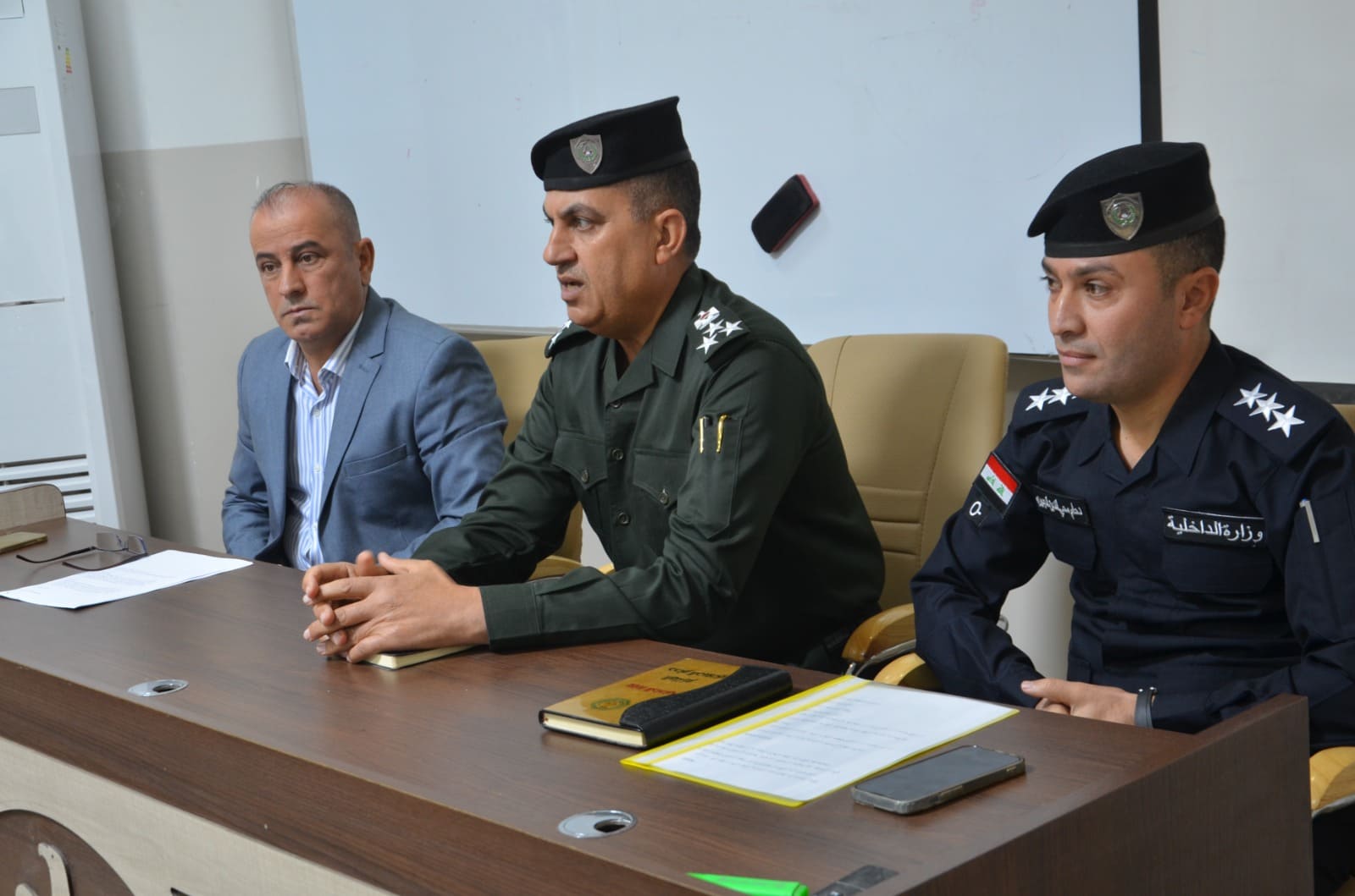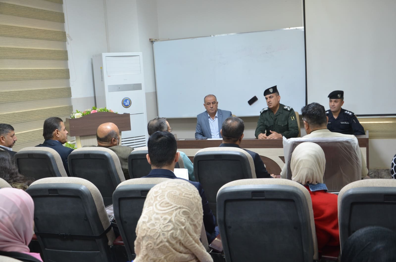 The seminar presentations were delivered by: Lt. Col. Dr. Baha’a A’ed Abdulla Captain Dahham Mohy Al-Din (Community Police Department – Salah al-Din Prof. Dr. Khalid Ali Saleh (College of Arts – Tikrit University) The seminar included discussions with attendees on the most common rumors circulating within society and ways to confront them, as well as providing awareness guidelines to students and university staff regarding the proper use of social media.